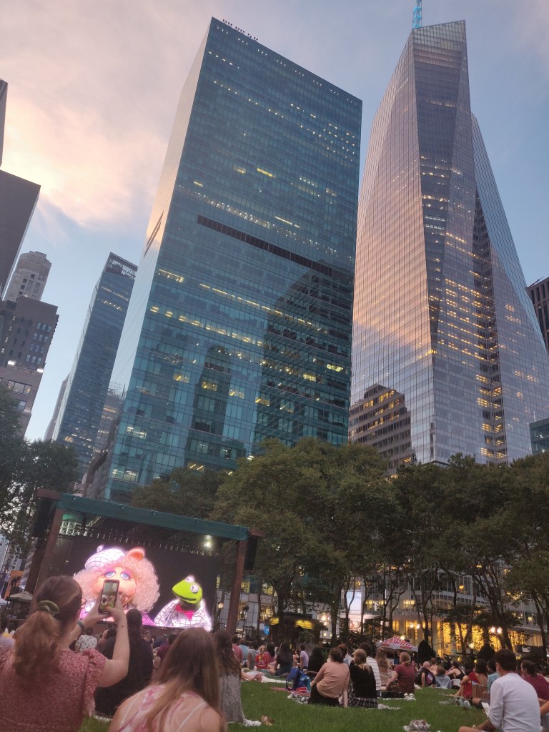 Nadat ik de hele dag gewerkt had ben ik na het avondeten met Jiwon (meisje uit Zuid-Korea) naar Bryant Park gelopen. Elke maandag en dinsdag hebben ze movie night in Bryant Park. Ze spelen dan een film af in de openlucht en het is toegankelijk voor iedereen. Dit keer speelde ze de film ‘The Muppets Take Manhattan’. Een hele leuke film om te zien en ook zeer toepasselijk om deze in Bryant Park te kijken.