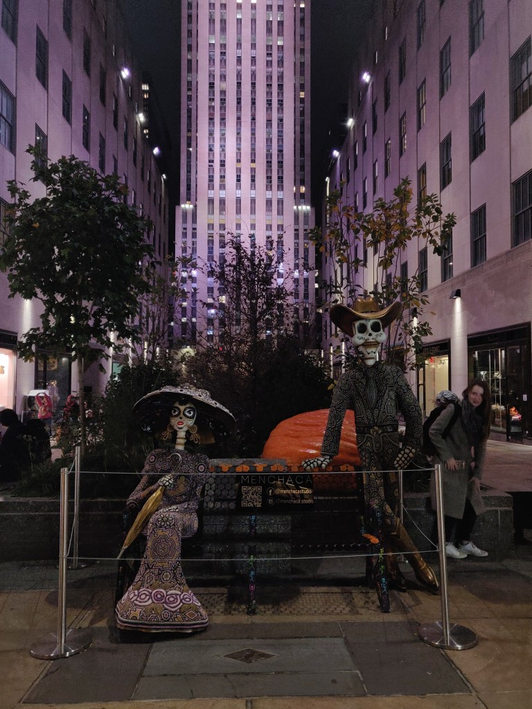 In de avond ben ik samen met Kelly en Cristina richting Rockefeller gelopen om de Dia de los Muertos art te zien die daar wordt tentoongesteld. Dia de los muertos is een Mexiaanse feestdag. Het is de dag van de doden.