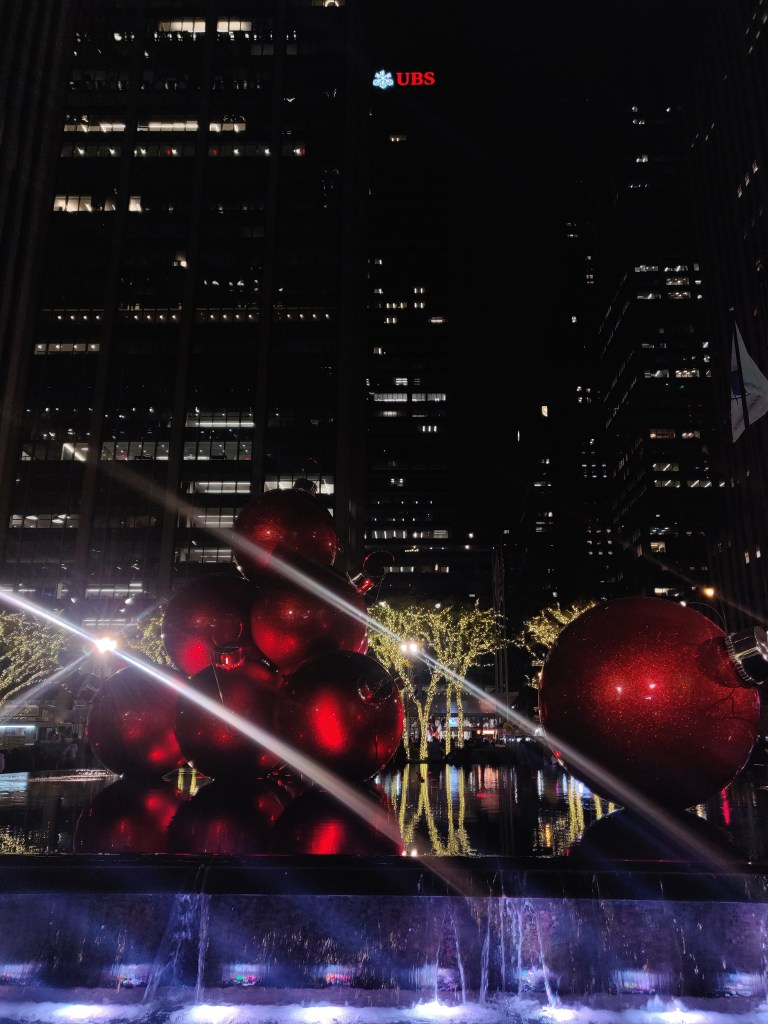 De welbekende kerstballen bij Radio City Musical Hall